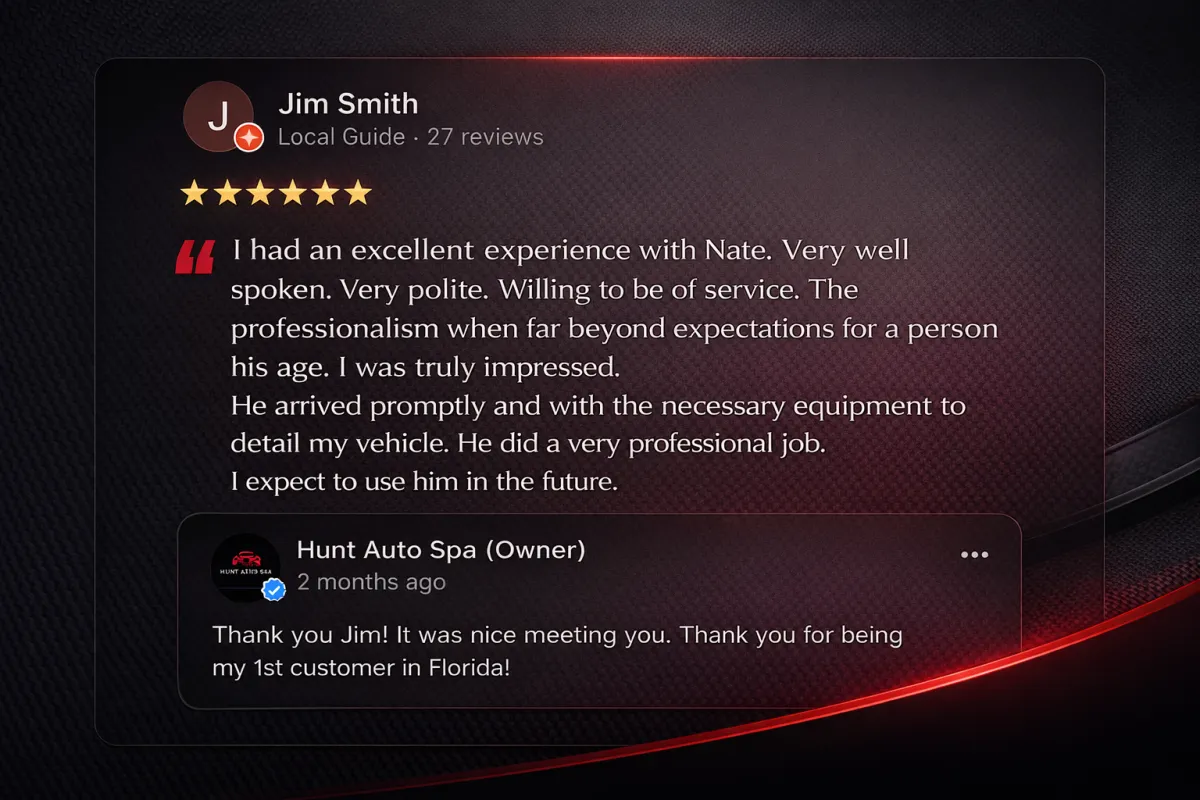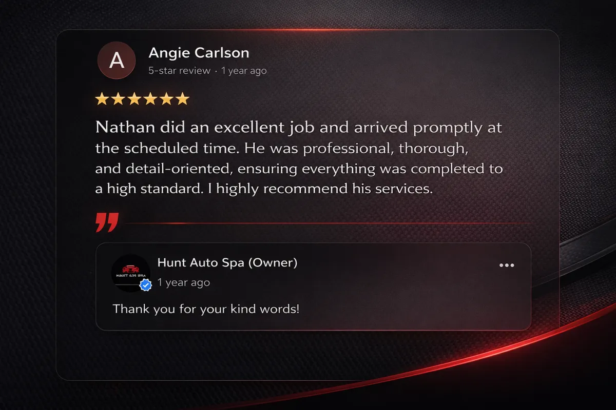 Our hours of operation are Monday through Saturday from 8:00 AM to 6:00 PM. During these hours, we offer full detailing services and customer support. We are closed on Sundays to allow our team to rest and recharge. If you need to schedule outside normal hours, feel free to reach out and we’ll do our best to accommodate.